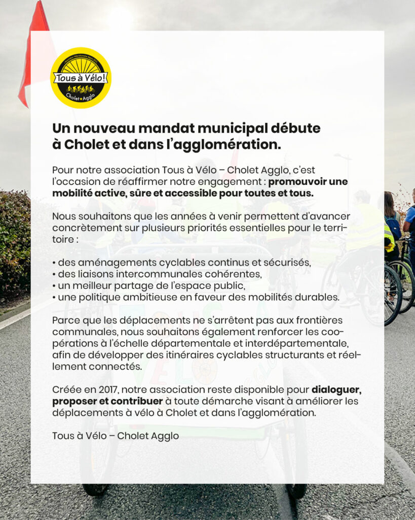 Pour notre association Tous à Vélo – Cholet Agglo, c’est l’occasion de réaffirmer notre engagement : promouvoir une mobilité active, sûre et accessible pour toutes et tous.